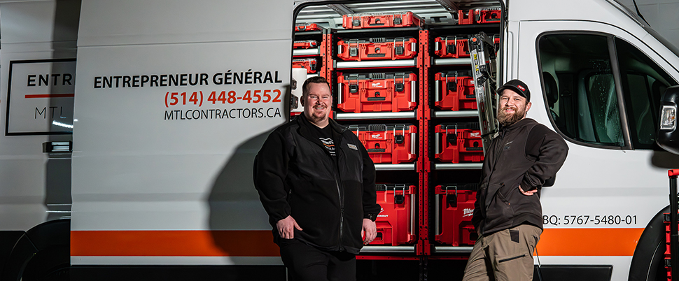 Les deux frères d’Entrepreneurs MTL se sont tournés vers le système PACKOUTMC de MilwaukeeMD en raison de la qualité de sa construction, mais aussi de son ingéniosité. Comme son équipe disposait déjà d’une gamme complète d’outils MilwaukeeMD, l’écosystème lui convenait parfaitement. En plus de sa compatibilité, il leur offrait également une certaine uniformité en leur permettant de choisir une disposition pour une fourgonnette, puis de la reproduire dans les trois autres fourgonnettes pour que chaque membre de l’équipe sache exactement où chaque article se trouve.